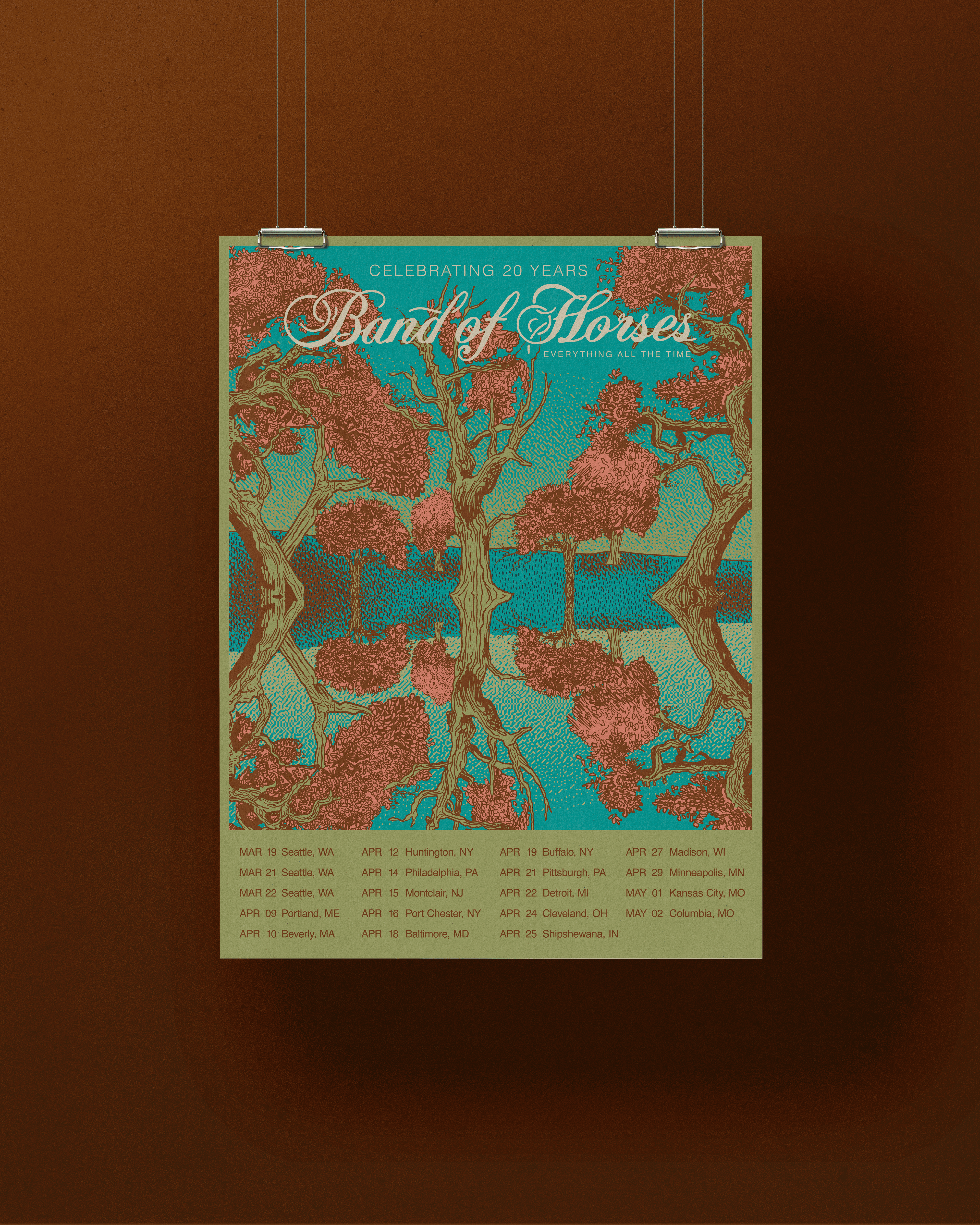 Poster design created for the 20th anniversary celebration of Band of Horses’ debut album Everything All The Time. The artwork was designed to capture the emotional atmosphere and expansive feeling of the record while working as a collectible piece for fans attending the anniversary shows.