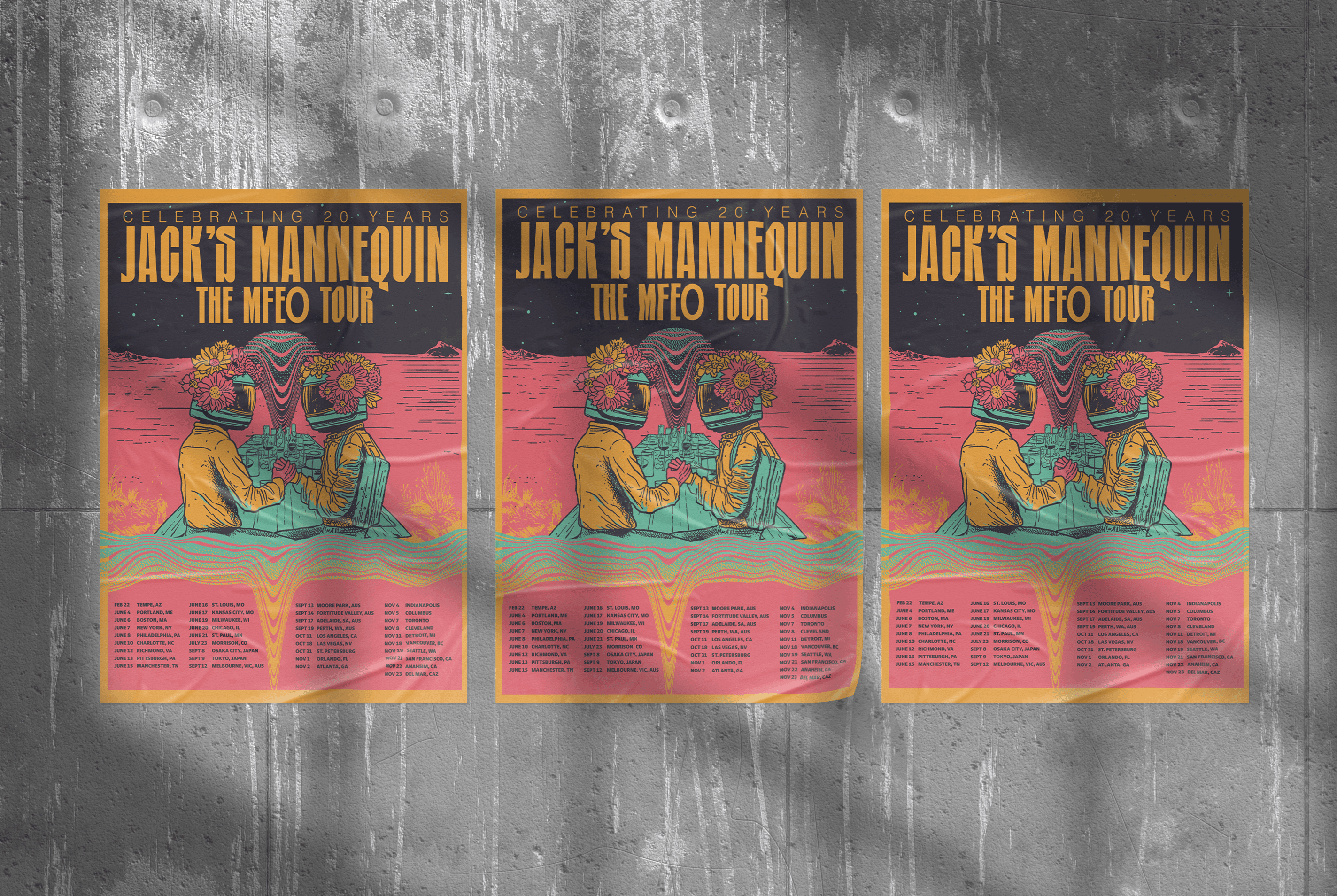 Poster and merchandise design created for Jack’s Mannequin’s MFEO Tour. The goal was to develop artwork that captured the emotional nostalgia and cinematic energy of the band while still feeling bold enough to stand out in tour promotion and merchandise.